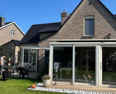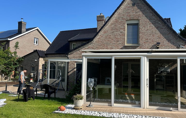 Bij deze woning hebben we met veel zorg en aandacht gewerkt aan de buitenruimte. Allereerst hebben we nieuwe tegels aangelegd in de tuin, wat niet alleen de uitstraling van de ruimte verbeterd heeft, maar ook de functionaliteit. Deze tegels zijn zorgvuldig geplaatst en stevig gefugeerd, zodat ze een ideale basis vormen voor verdere tuinontwikkeling en gebruik. Na het aanleggen van de tegels hebben we ons gericht op het creëren van een prachtige en ruime glazen gesloten terras.